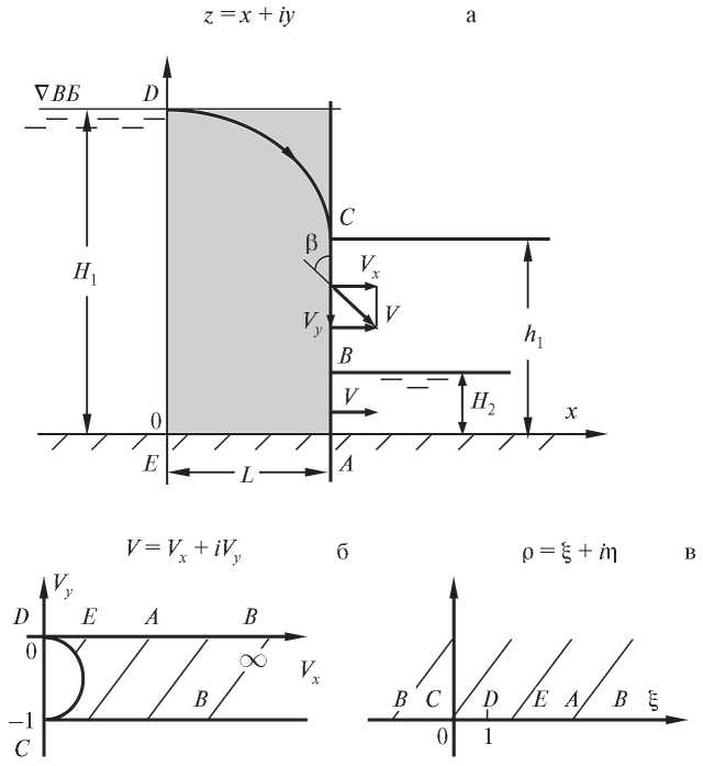 Вышеприведенные исследования (из огромного числа работ по этой тематике) определяют основные характеристики фильтрационного потока через перемычку, однако, до настоящего времени наименее изученным остается вопрос определения скоростей в самой области фильтрации перемычки. Известные гидромеханические решения [7–10, 15, 16] позволяют находить параметры фильтрации только лишь по контуру области фильтрации [18–20], поскольку конформное отображение годографа скорости фильтрации (криволинейного треугольника) на полуплоскость, осуществляемое модулярной эллиптической функцией [19], рассматривается в них только для действительной оси комплексной полуплоскости (рис. 1,б). Кроме этого, указанные решения являются полуобратными, а потому не могут дать прямого аналитического решения в явном виде задачи фильтрации для перемычки с наперед заданными граничными условиями, а из-за чрезвычайной математической сложности имеют ограниченные возможности для прикладных исследований – так, известны всего 6 случаев перемычек с аналитическим расчетом скоростей фильтрации по их верховым граням и подошвам, в том числе только для одной “перемычки Гамеля–Гюнтера” с расчетом скоростей по низовой грани (рис. 2).