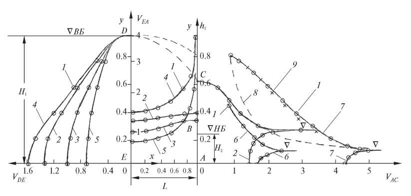 На рис. 3 приведена впервые построенное по элементарным формулам семейство кривых 1 изотах (линий равных скоростей фильтрации) для внутренней области фильтрации перемычки при отсутствии воды в нижнем бьефе: , , , (случай IX), из которого видно крайне неравномерное распределение скоростей в теле перемычки. Наличие сильнонапряженного, опасного участка с резко возрастающими градиентами скоростей фильтрации характеризуется сильным сгущением линий изотах в нижней правой части перемычки при явной “недогруженности” зон с разряженными линиями изотах в верхних (левой и срединной) частях области фильтрации. Приведены также рассчитанные эпюры скоростей фильтрации: – входных на верховой грани (кривая 2); – продольных по линии подошвы (кривая 3); – полных выходных V на низовой грани (кривая 4) и их горизонтальной составляющей (кривая 5), а также очертание кривой депрессии по зависимости (2.17).