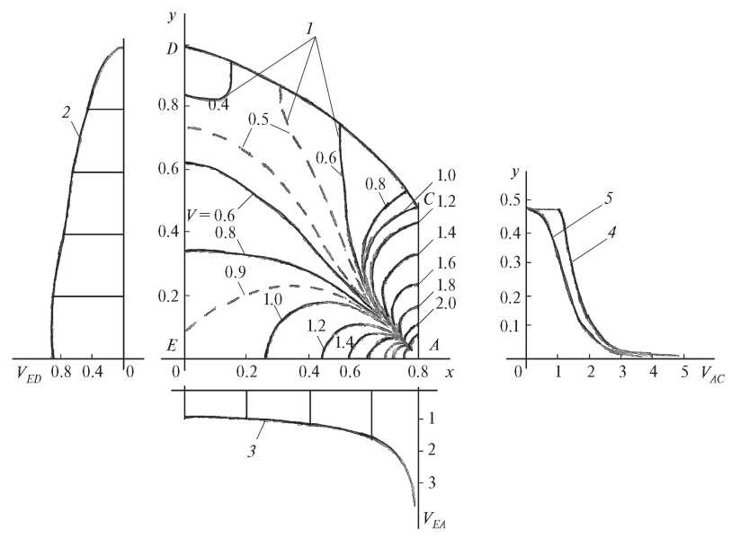Рис. 3. Фильтрация в геофизической перемычке при отсутствии воды в нижнем бьефе: , , , (случай IX): 1 – семейство изот на внутренней области перемычки; 2 – эпюра входных скоростей фильтрации на верховой грани ; 3 – эпюра продольных скоростей фильтрации по линии подошвы ; 4 и 5 – эпюры полных выходных скоростей фильтрации V и на низовой грани .