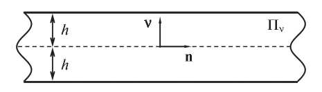 Рис. 1. Слой толщиной 2h; единичный вектор n направлен вдоль распространения волны; v – нормаль к срединной плоскости Πν