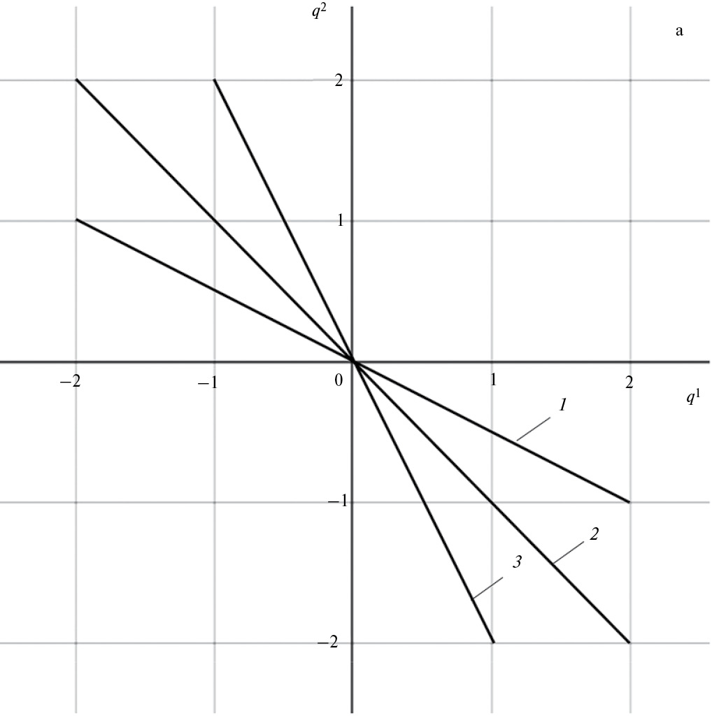 На рис. 2 для всех трех примеров для наглядности представлены графики зависимостей уравнений голономных связей для рассматриваемых случаев. Размерности параметров, при которых построены графики согласуются с размерностями обобщенных координат и .