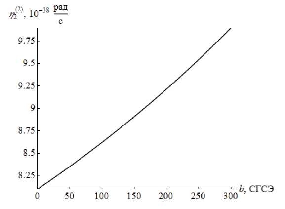 Рис. 7. Зависимость величины поправки декремента затухания капиллярных осцилляций, связанного с излучением электромагнитных волн капли радиуса R = 10 мкм и заряда Q = 2 · 10−5 СГСЭ (~ 0.01Qкр), от подвижности носителей заряда b.