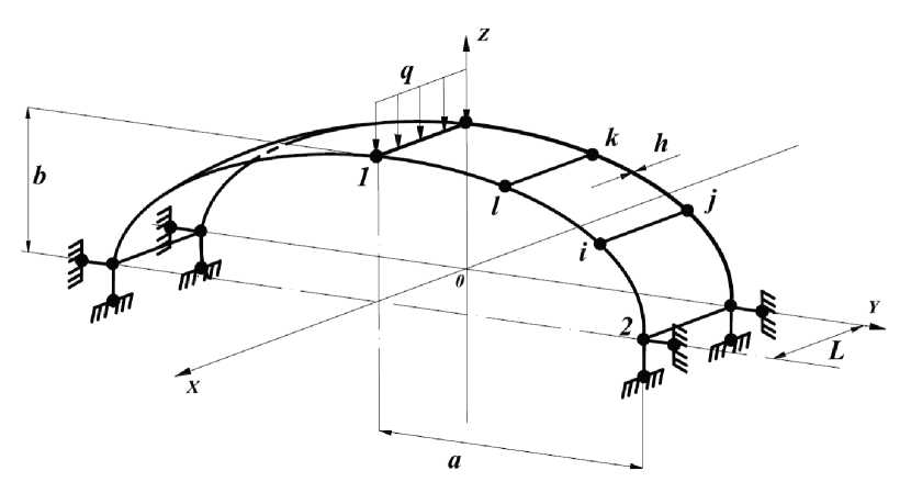 Для построения дискретной модели оболочки был выбран четырехузловой конечный элемент в виде фрагмента срединной поверхности с узлами i, j, k, l.