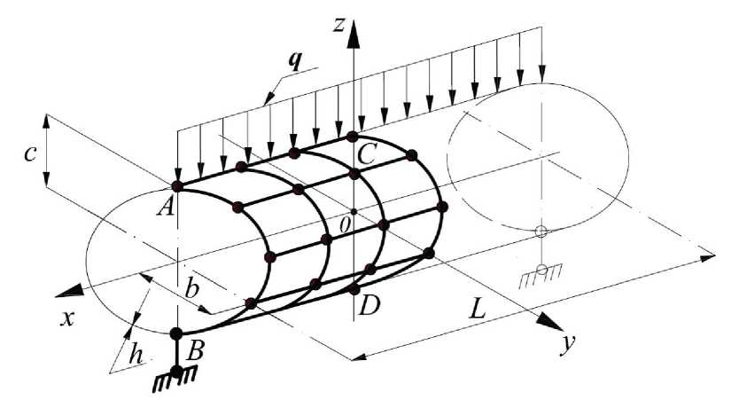Теория расчета тонких оболочек в настоящее время является достаточно развитой [1–4] при различных видах нагружения. Аналитические решения уравнений теории тонких оболочек оказались возможными лишь в некоторых частных случаях, далеких от инженерной практики. Поэтому актуальными оказались разработки численных методов решения уравнений теории оболочек. Среди численных методов решения задач деформирования инженерных конструкций получил развитие и широкое использование метод конечных элементов (МКЭ) [5–7]. Наиболее широкое использование при расчете оболочек получил МКЭ в формулировке метода перемещений [8–14]. МКЭ в формулировке метода перемещений использовался в расчетах трехслойных оболочек [15–22]. Для обоснования разработанной методики расчета трехслойных оболочек в [21, 22] выполнено сравнение полученных результатов с аналитическими решениями других исследователей.