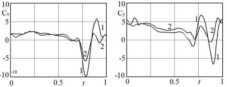 В левой части рис. 7 показано поведение коэффициента подъемной силы Cy(t), кривая 1 представляет простые крылья, а кривая 2 – складные. Видно, что негативная подъемная сила значительно уменьшилась, но вместе с ней неожиданно уменьшилась и позитивная часть подъемной силы. Из сравнения кривых на графике видно, что экстремальные значения Cy(t) на складных крыльях уменьшились примерно в три раза по сравнению с простыми крыльями. А так как амплитуды движений крыльев, т.е. их перемещения, в эксперименте были сохранены, то соответственно работа, совершаемая складными крыльями, втрое меньше, чем энергозатраты в случае простых крыльев. Так в эксперименте со складными крыльями вместо ожидаемого роста подъемной силы неожиданно раскрылся способ трехкратной экономии энергии!