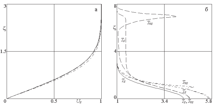 Результаты расчетов профилей скорости и температур стационарного течения приведены на рис. 1. Здесь и на остальных рисунках в статье сплошными линиями показаны результаты для совершенного газа, штрихпунктирными – для колебательно возбужденного газа вблизи пластины при ζ0p = 1, I0p = 0.5 и штриховыми – для колебательно возбужденного газа с источником в верхней части пограничного слоя при ζ0h = 7, I0h = 1.