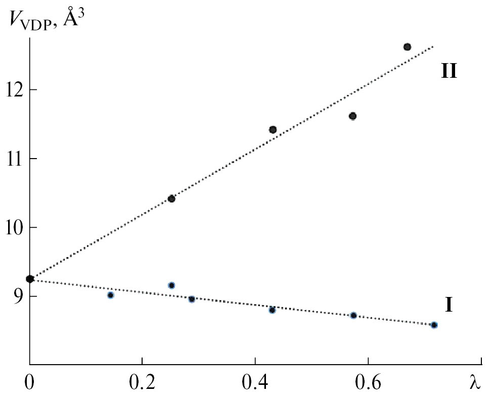 Рис. 1. Зависимость объема ПВД (VVDP) атомов U(VI) в комплексах UObFc (I) и UObClc (II) от λ, где λ = c/(b + c). Линии регрессии для UObFc отвечает уравнение (2). Для UObClc использованы данные работы [17].
