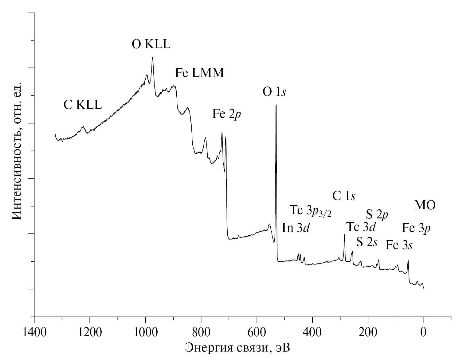 В обзорном спектре РФЭС образца I наблюдались линии железа, серы, технеция, углерода, кислорода, индия подложки и отсутствовали интенсивные линии никеля (рис. 1).