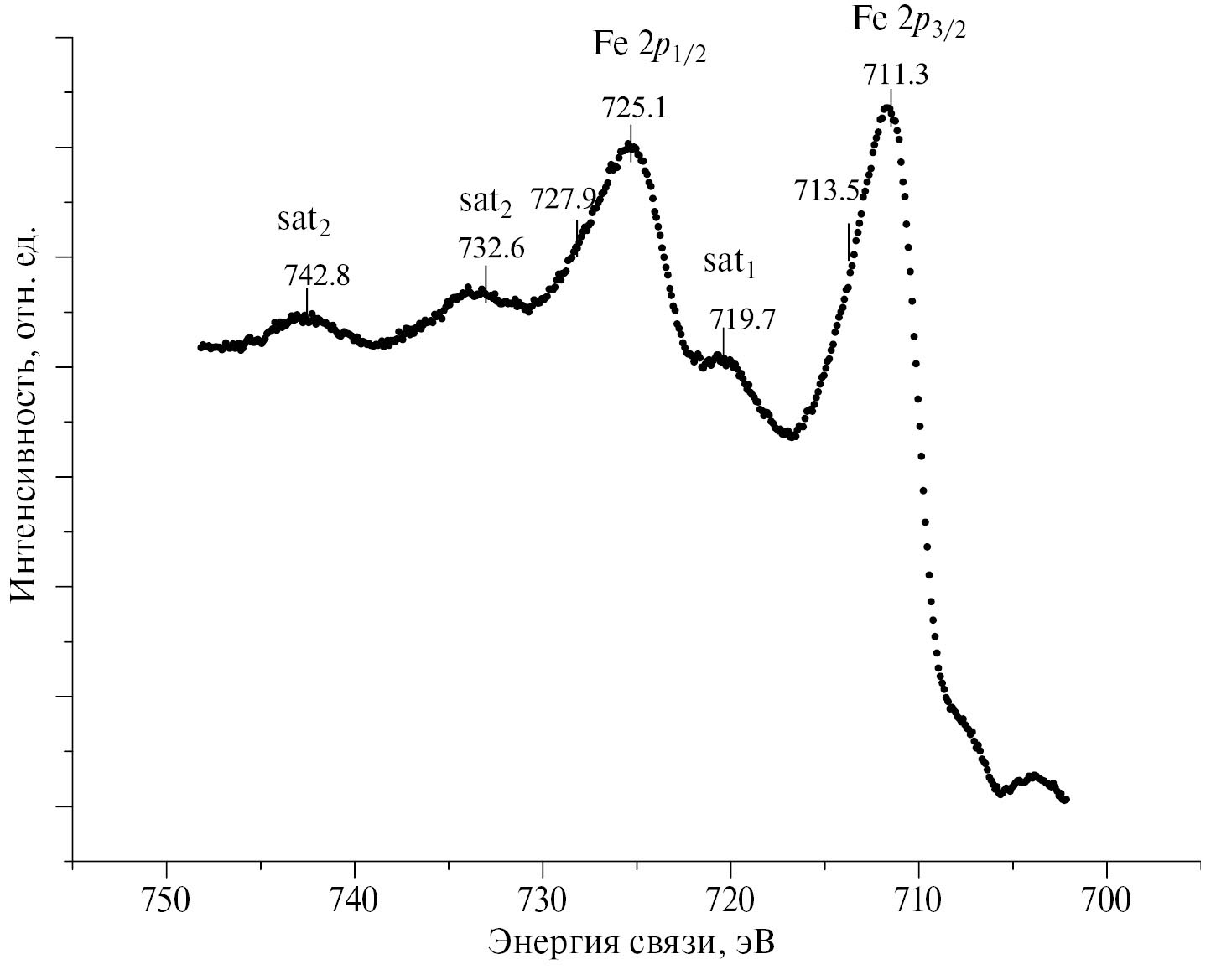 Степень окисления железа. Энергии связи и сложная структура спектра Fe 2p-электронов пирротина/пирита были характерны в основном для Fe(III) [48]. Параметры сложной структуры спектра Fe 2p-электронов образца I и расстояния до shake-up сателлитов характерны для иона Fe3+ [49] (рис. 5). В случае Fe3+ shake-up сателлиты наблюдаются со стороны больших энергий связи от основных линий при ~8 эВ, а в спектре Fe2+ — при ~6 эВ [50–52].