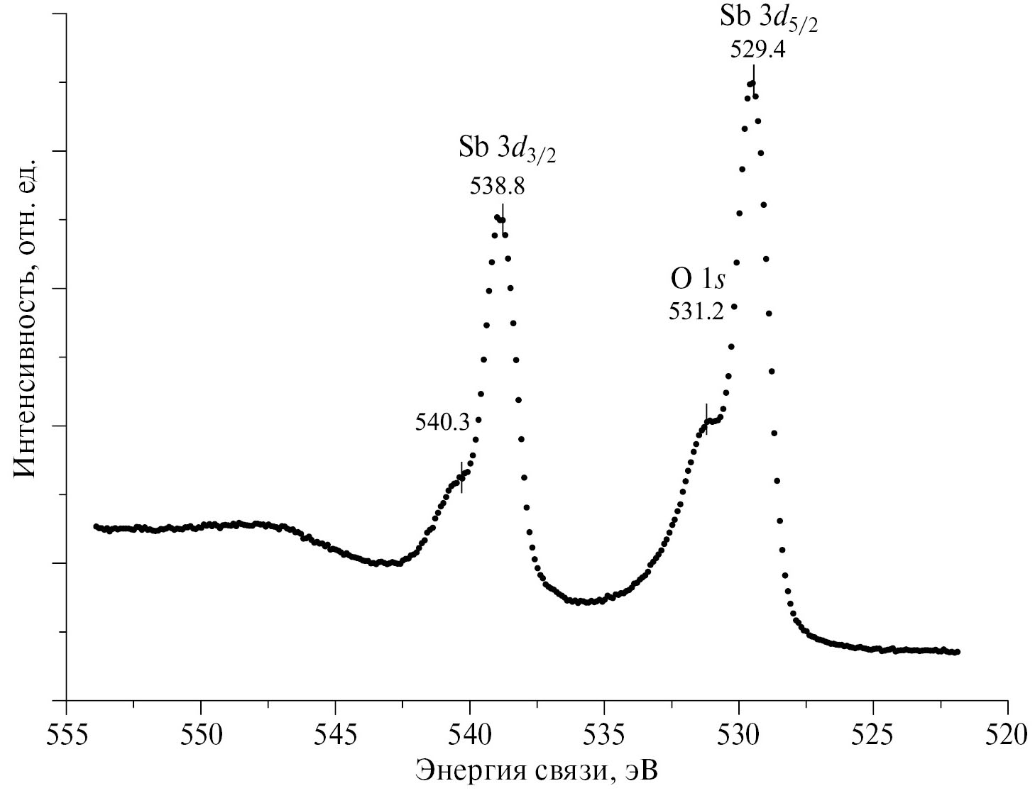 Степень окисления сурьмы. Поскольку спектр O 1s-электронов накладывается на высокоэнергетическую компоненту Sb 3d5/2-электронов, это позволяет определить интенсивность линии O 1s-электронов. Спектр Sb 3d-электронов на стибните состоит из двух дублетов, на которые накладывается линия O 1s-электронов при 531.2 эВ (рис. 6) (табл. 2).