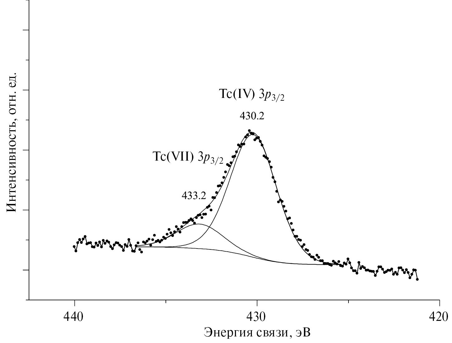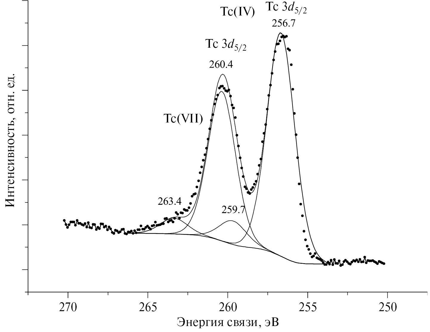 Сульфидные фазы технеция. Важно отметить, что в спектрах исследуемых образцов не наблюдалось линий, характерных для сульфидных фаз технеция. Согласно работе [42], для Tc2S7 энергия связи Tc 3d5/2-электронов равна 254.7 эВ [23]. В работе [47] показано, что для TcSx энергия связи Tc 3d5/2-электронов равна 253.8 эВ.