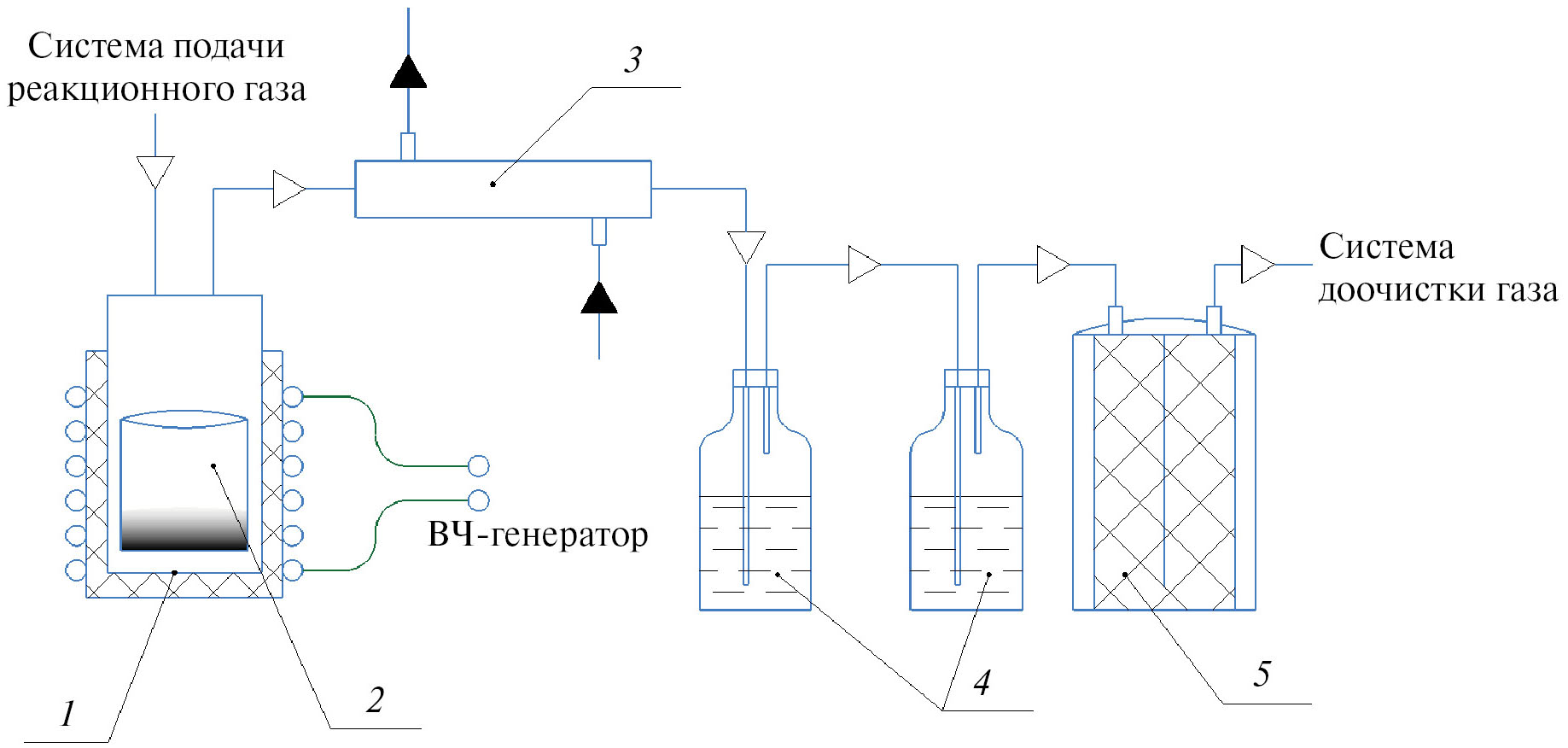 Рис. 2. Упрощенная схема опытной установки двухстадийной волоксидации. 1 – реактор; 2 – тигель с порошком ОЯТ (масса тигля 51 г); 3 – холодильник; 4 – барботеры; 5 – сепаратор с аэрозольным фильтром на основе алюмосиликатной ваты.