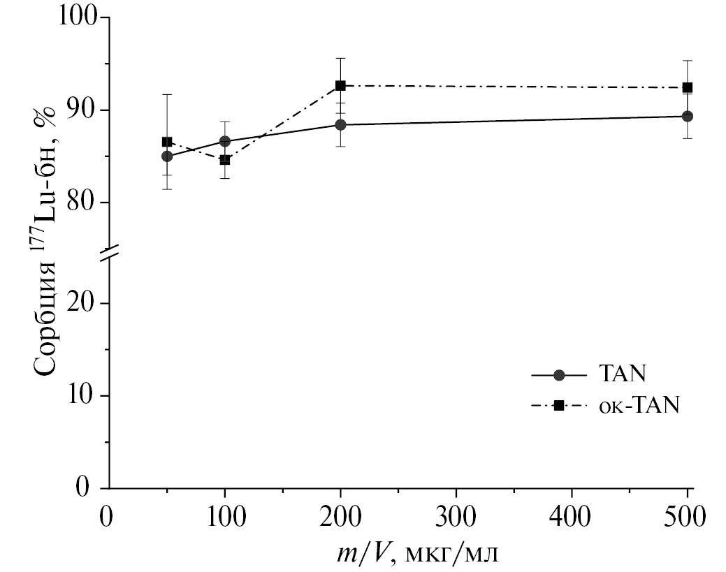 Таким образом, нами изучена зависимость сорбции 177Lu-сн и 177Lu-бн различными коммерческими и окисленными НА от рН, отношения m/V и количества носителя, при этом установлено, что все перечисленные факторы оказывают существенное влияние на сорбцию. Показано, что при небольших отличиях физико-химических свойств коммерческих и окисленных НА сорбция ими 177Lu может как быть одинаковой (в случае TAN и ок-ТАN), так и отличаться (в случае STP и ок-STP). Установлено, что лучшим сорбентом из изученных НА является ок-STP, а оптимальной средой являются растворы с рН 5.0–5.6, при этом количественная сорбция 177Lu-сн и 177Lu-бн наблюдается в первые 30 мин контакта. Установлено, что для сорбции 1.2 ГБк 177Lu-бн достаточно 500 мкг ок-STP, при этом сорбированный на ок-STP 177Lu-бн устойчив в изотоническом растворе в течение 15 ч. В то же время для сорбции 80 МБк 177Lu-бн, что достаточно для in vivo экспериментов, достаточно использовать 100 мкг ок-STP. Таким образом, по сорбционным свойствам ок-STP является наиболее перспективным НА из изученных для дальнейших экспериментов, в первую очередь направленных на разработку конъюгатов НА с 177Lu с оптимальными размерами агрегатов в растворе, что планируется нами к изучению в дальнейшем.