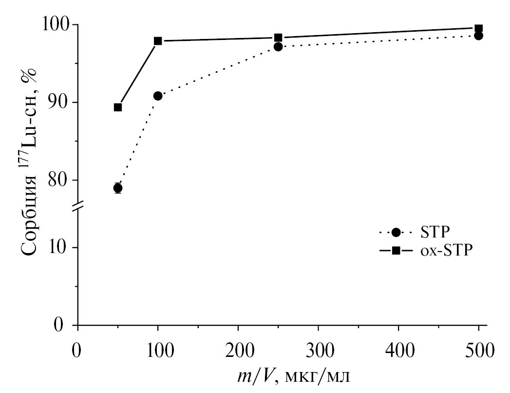 Таким образом, показано, что окисление STP существенно влияет на сорбцию ими 177Lu, так как во всех изученных средах ок-STP сорбируют быстрее и степень сорбции при одних и тех же условиях на ок-STP выше, чем на STP.