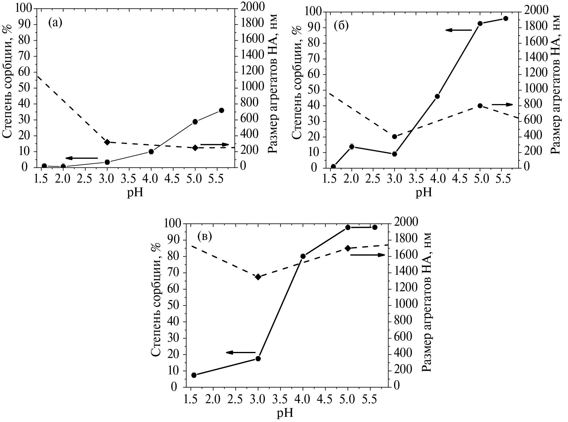 Рис. 5. Степень сорбции 177Lu за 30 мин и размеры агрегатов НА в зависимости от рН образцами TAN (а), STP (б) и ок-STP (в).