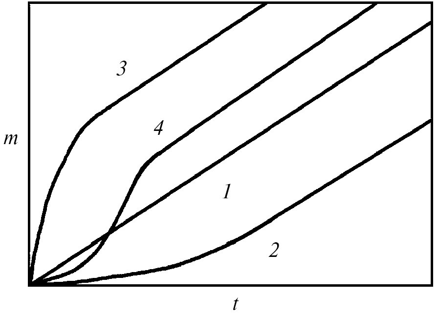 Типы кривых выхода элементов при сквозной диффузии в поровом растворе, приведенные на рис. 1 в координатах масса элемента/время [4], характеризуют смену режимов диффузии: от нестационарного для нелинейных (с повышающейся или понижающейся скоростью выхода) кривых выхода к стационарному – для линейных (с постоянной скоростью) кривых выхода (кривая 1 и линейные участки кривых 2–4). Нелинейность кривых выхода может быть связана с сорбционным процессом, по мере протекания которого скорость выхода элемента повышается (кривая 2), или с осадительным процессом в поровом растворе, по мере протекания которого скорость выхода элемента понижается (кривая 3). Осадительный и сорбционный эффекты в процессе диффузии могут наблюдаться одновременно (кривая 4).