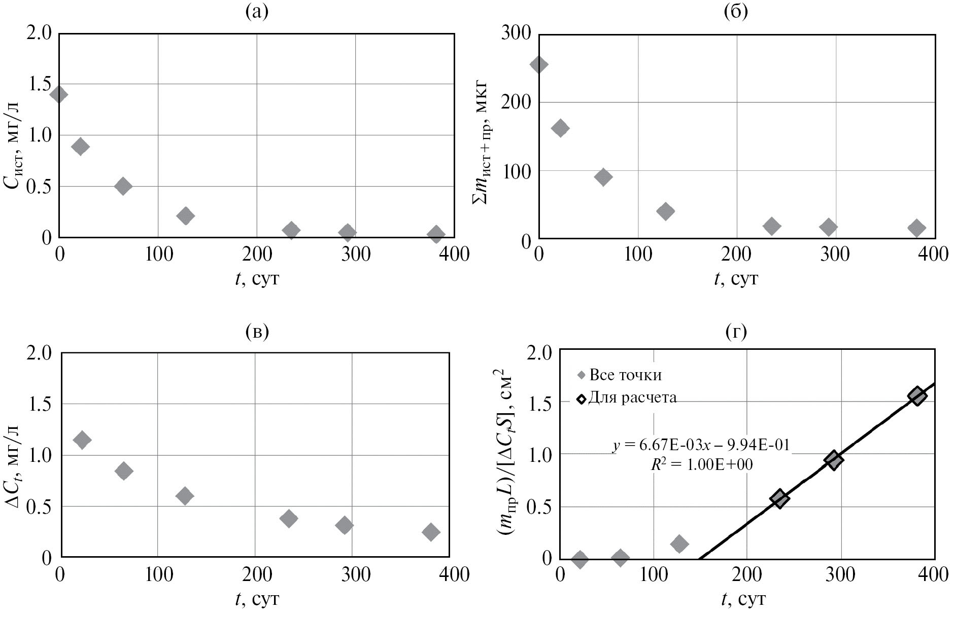 Рис. 2. Сквозная диффузия Cs через образец милонита ТЗ (ρт = 1.96 г/см3, L = 3.5 мм) из модельного раствора МПВИ-6: (а) – изменение концентрации Cs в камере-источнике, (б) – суммарная масса Cs в источнике и приемнике, (в) – изменение усредненного значения разницы концентраций Cs в источнике и приемнике, (г) – удельный суммарный выход массы Cs в приемник; DeCs = 7.72 × 10–8 см2/с, KdCs = 26 см3/г.