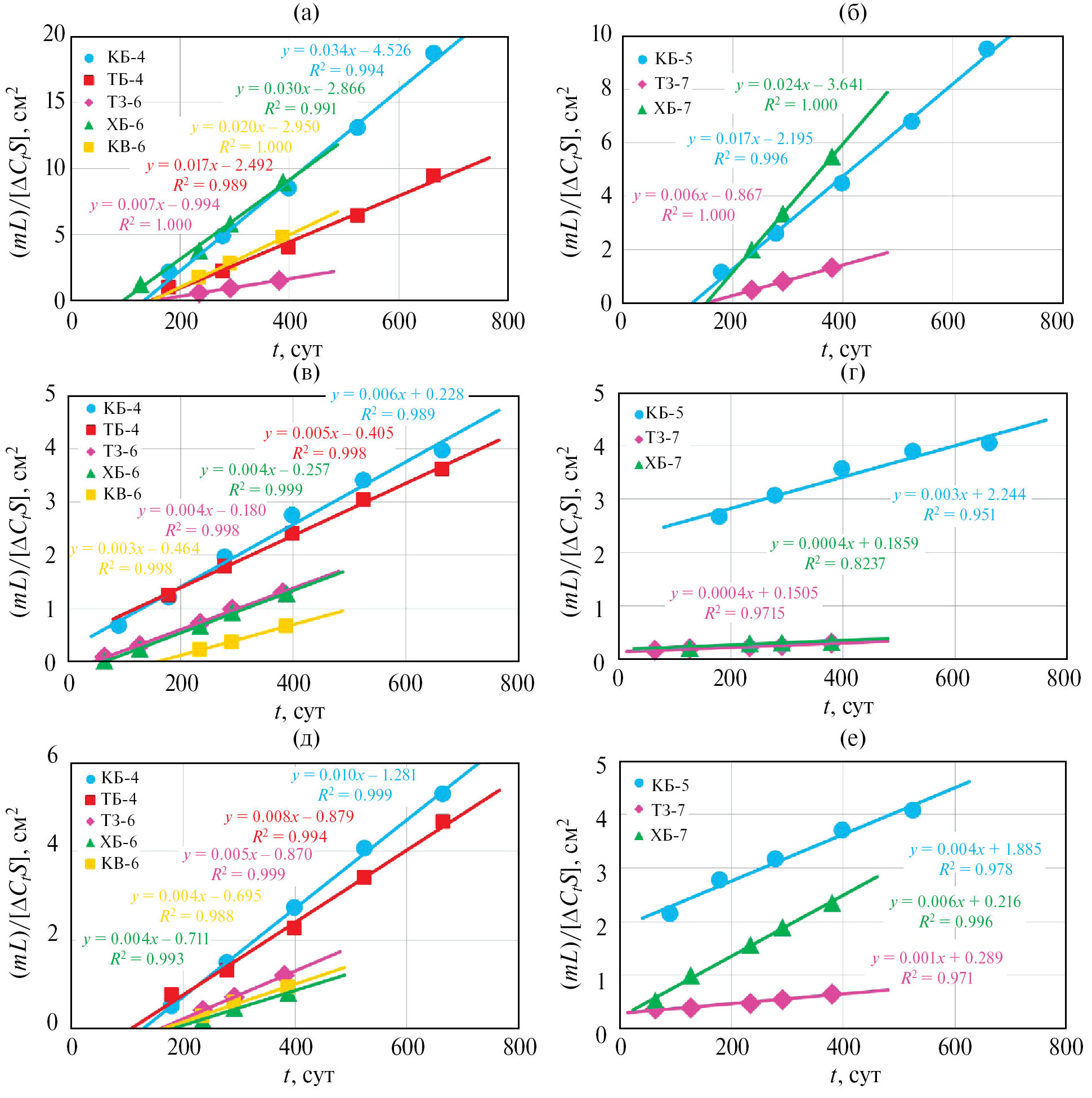 Рис. 3. Стационарные участки кривых выхода элементов при диффузии из модельных растворов через уплотненные образцы глинистых материалов: (а) – Cs/МПВИ, (б) – Cs/МВ, (в) – U/МПВИ, (г) – U/МВ, (д) – Se/МПВИ, (е) – Se/МВ.