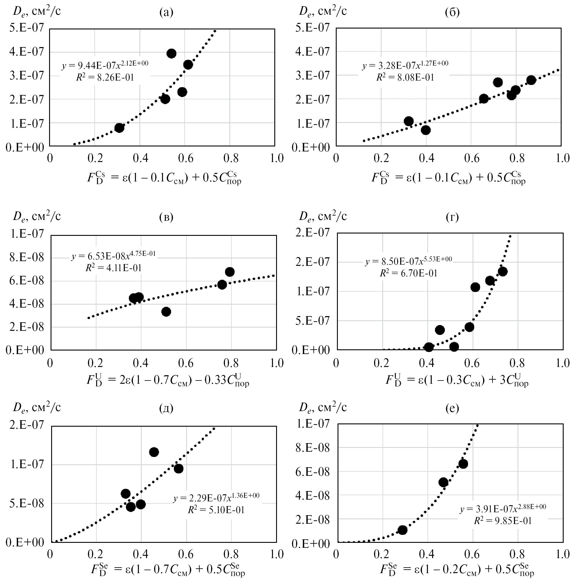 При диффузии селена в разных солевых системах решающую роль играет степень влияния содержания смектита в глинистом материале (Cсм). В модельной подземной воде этот фактор очень весом и во многом определяет общий фактор диффузии (рис. 7, д), в модельном выщелате влияние содержания смектита невелико и общий фактор диффузии определяется в основном пористостью материала (рис. 7, в). Концентрация селена в поровом растворе (СSeпор) в обоих случаях влияет на FDSe одинаково. Общий вид зависимостей эффективного коэффициента диффузии селена в поровых растворах глинистых материалов подобен для обоих составов модельных растворов. Однако с учетом разницы в расчете значений FDSe эти зависимости могут быть корректно описаны модельными уравнениями только по отдельности: для модельной подземной воды (МПВИ) –