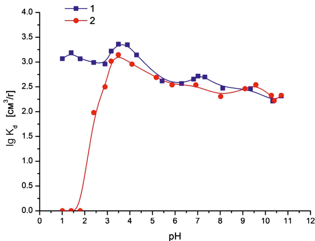 В интервале рН от 1.1 до 1.8 106Ru сорбируется только на катионите, что указывает на преобладание в растворе катионных форм исследуемого радионуклида. Далее в интервале рН от 1.8 до 3.2 происходит рост задержания 106Ru на анионите, а при рН ≥ 3.2 сорбция на катионите и анионите становится одинаковой, что свидетельствует о переходе 106Ru из ионного состояния в неионное (псевдоколлоидное).