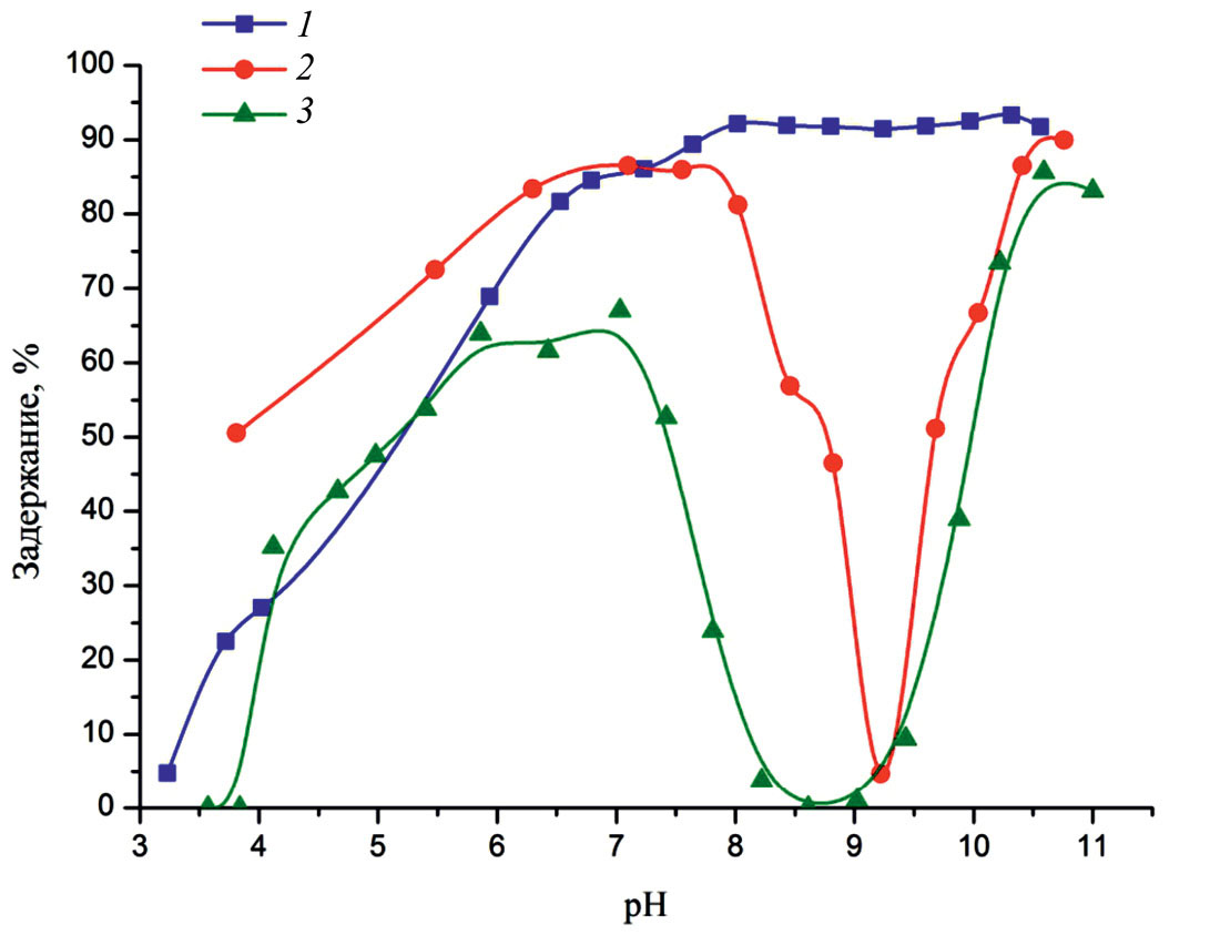 Рис. 4. Задержание 106Ru ультрафильтрационной мембраной с переделом отсечения 100 кДа в зависимости от рН раствора в присутствии гидроксоформ Fe(III) и борной кислоты в концентрации, г/дм3: 1 – 5, 2 – 10, 3 – 16.