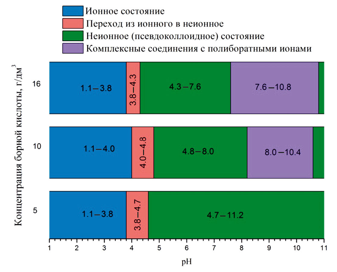 Повышение концентрации борной кислоты и изменение pH вызывают перестройку ее комплексов и увеличение доли три- и тетрабората [10].