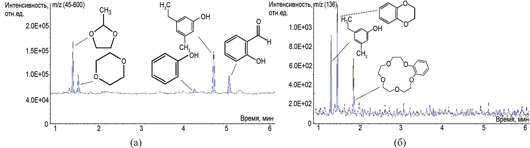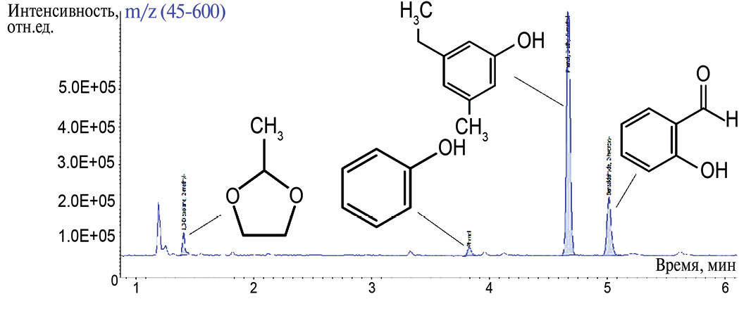 В результате анализа полученных хроматограмм образца 2 идентифицированы 2-метил-1,3-диоксолан, 1,4-диоксан, фенол, 3-метил-5-этилфенол, 2-гидроксибензальдегид, а также «тяжелые» соединения – 3-метил-5-этилфенол, 2,3-дигидро-1,4-бензодиоксин, бензо-15-краун-5 (бензопроизводное краун-эфиров с меньшим размером полости кольца).