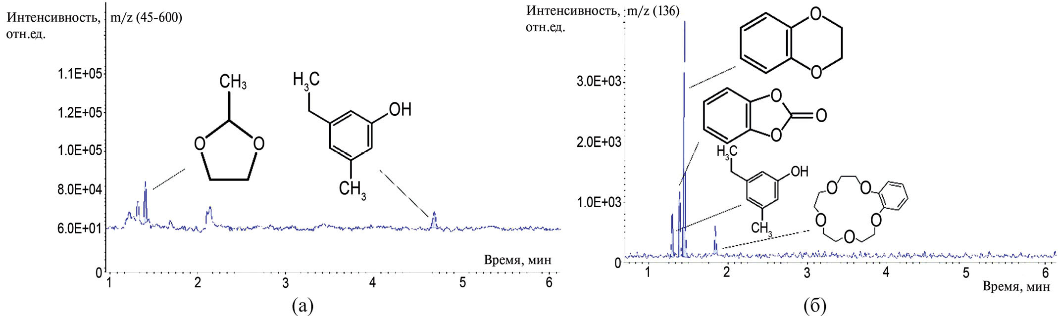 При переходе от инертной атмосферы к окислительной нагрев образца 2 сопровождается выходом летучих продуктов: 2-метил-1,3-диоксолана, 3-метил-5-этилфенола, 3-метил-5-этилфенола, 1,3-бензодиоксол-2-она, 2,3-дигидро-1,4-бензодиоксина, бензо-15-крауна-5 при температурах колонки 80 и 180°С (рис. 5).