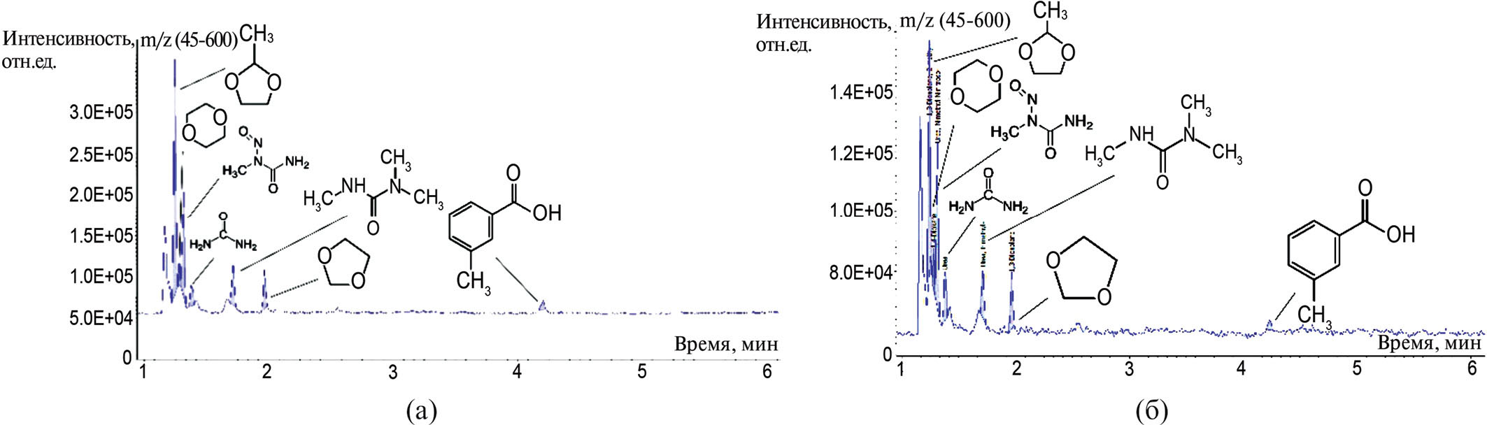 Анализ рис. 8 показал, что для образца 3 наблюдается выделение следующих соединений в газообразном состоянии: 2-метил-1,3-диоксолан, 1,4-диоксан, 1,3-диоксан, карбамид, N-метил-N-нитрозокарбамид, триметилкарбамид, как в инертной, так и в окислительной атмосферах. При этом в инертной атмосфере была также идентифицирована 3-метил-бензойная кислота.
