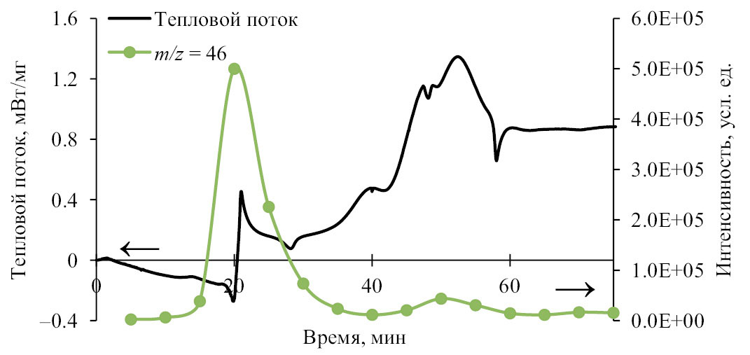 Как видно из рис. 9, интенсивность выделения оксидов азота (m/z = 46) возрастает в момент времени 20 и 50 мин, что соответствует испарению ДХЭ в области температур 100–120°С и протеканию основного процесса тепловыделения. Предположительно при контакте диоксида азота с раствором ДБ21К7 в ДХЭ образуются промежуточные неустойчивые нитросоединения, которые при нагреве в окислительной атмосфере разлагаются до оксидов азота [19]. Либо диоксид азота растворяется в ДХЭ и выделяется одновременно с его испарением. После завершения испарения ДХЭ в диапазоне температур 120–150°С наблюдается экзотермический эффект, который, вероятно, связан с разложением или окислением продуктов, образующихся при взаимодействии ДБ21К7 в ДХЭ с диоксидом азота, о чем свидетельствует второй максимум пика m/z = 46 на 50-й минуте.