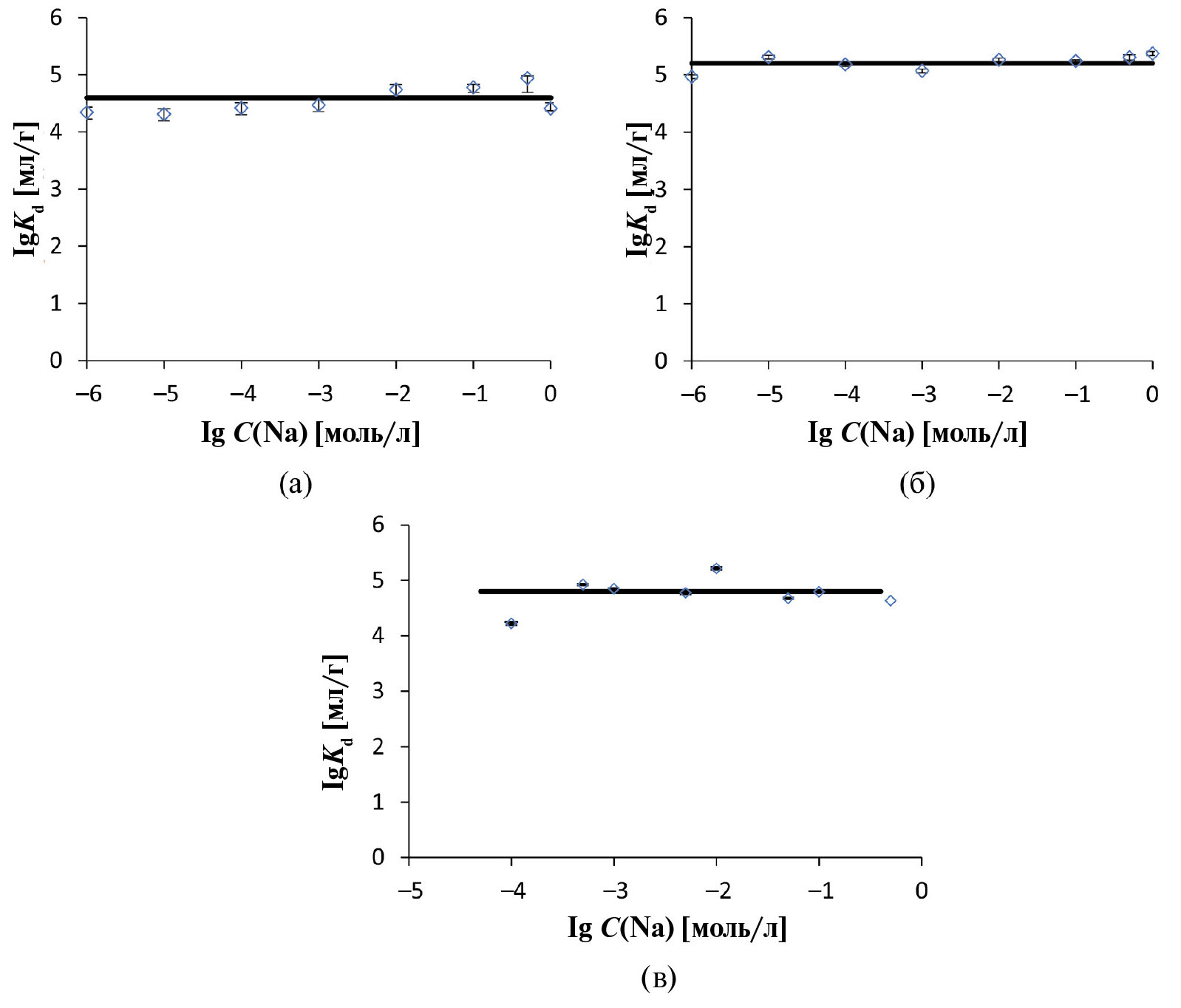 Влияние концентрации натрия в растворе на специфичность сорбентов исследовали, используя дистиллированную воду, меченную радионуклидом 137Cs, с добавлением изотопного носителя в виде раствора CsCl. Концентрацию ионов натрия в растворе от 10–6 до 1 моль/л задавали раствором NaCl. Масса сорбента составляла 20 мг, объем пробы – 50 мл. Время контакта фаз составляло 1 неделю.