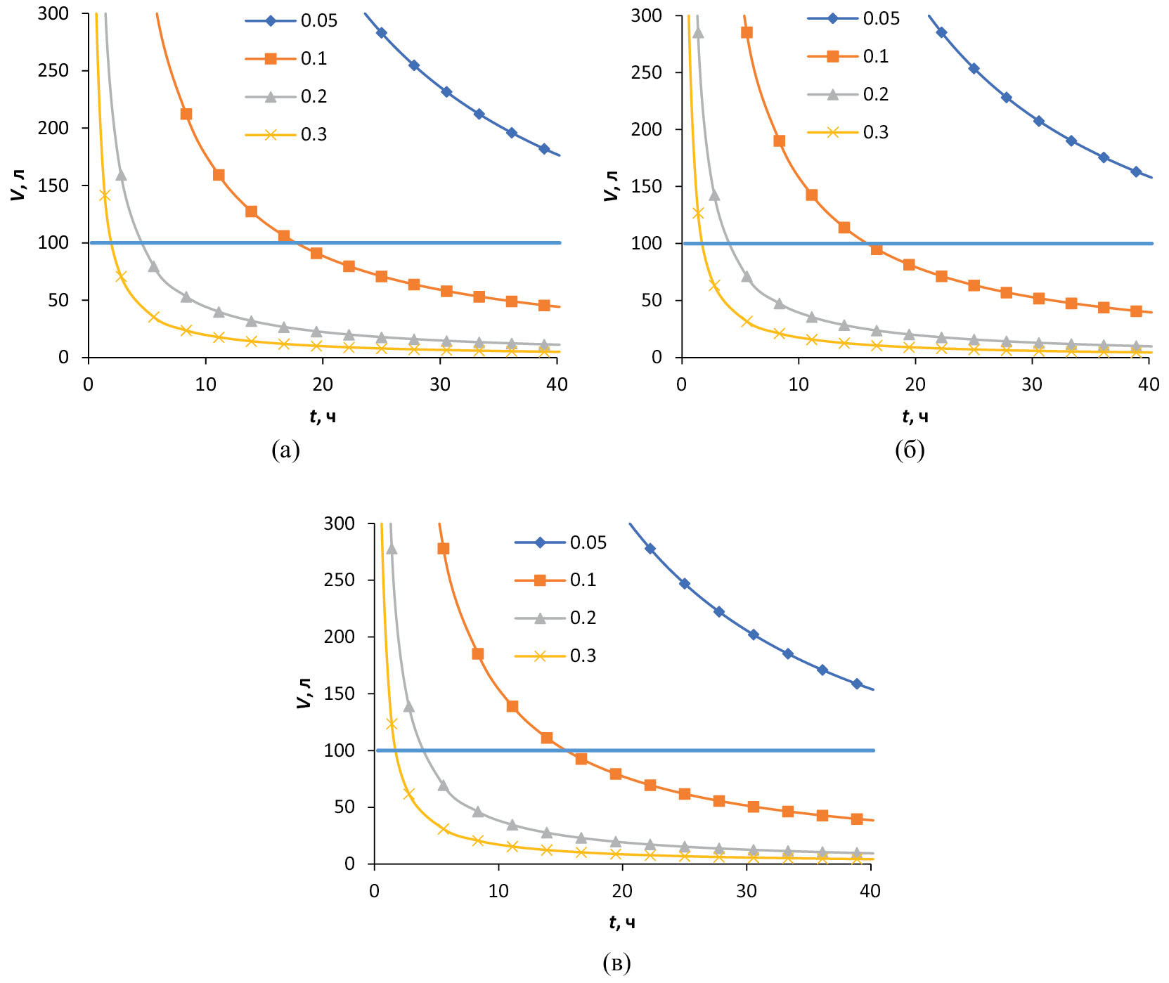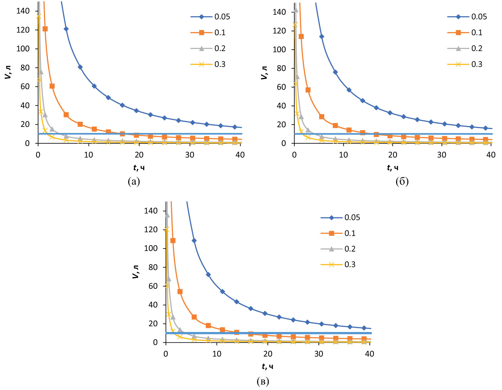 Рис. 4. Соотношение объемов пробы, времени измерения концентрата и относительной погрешности результата измерения концентрата при определении удельной активности 137Cs с МОА = 0.001 Бк/л: а – сорбент Т-35, mс = 5 г; б – сорбент НКФ-Ц, mс = 1 г; в – сорбент НКФ-ГДТ, mс = 3 г.