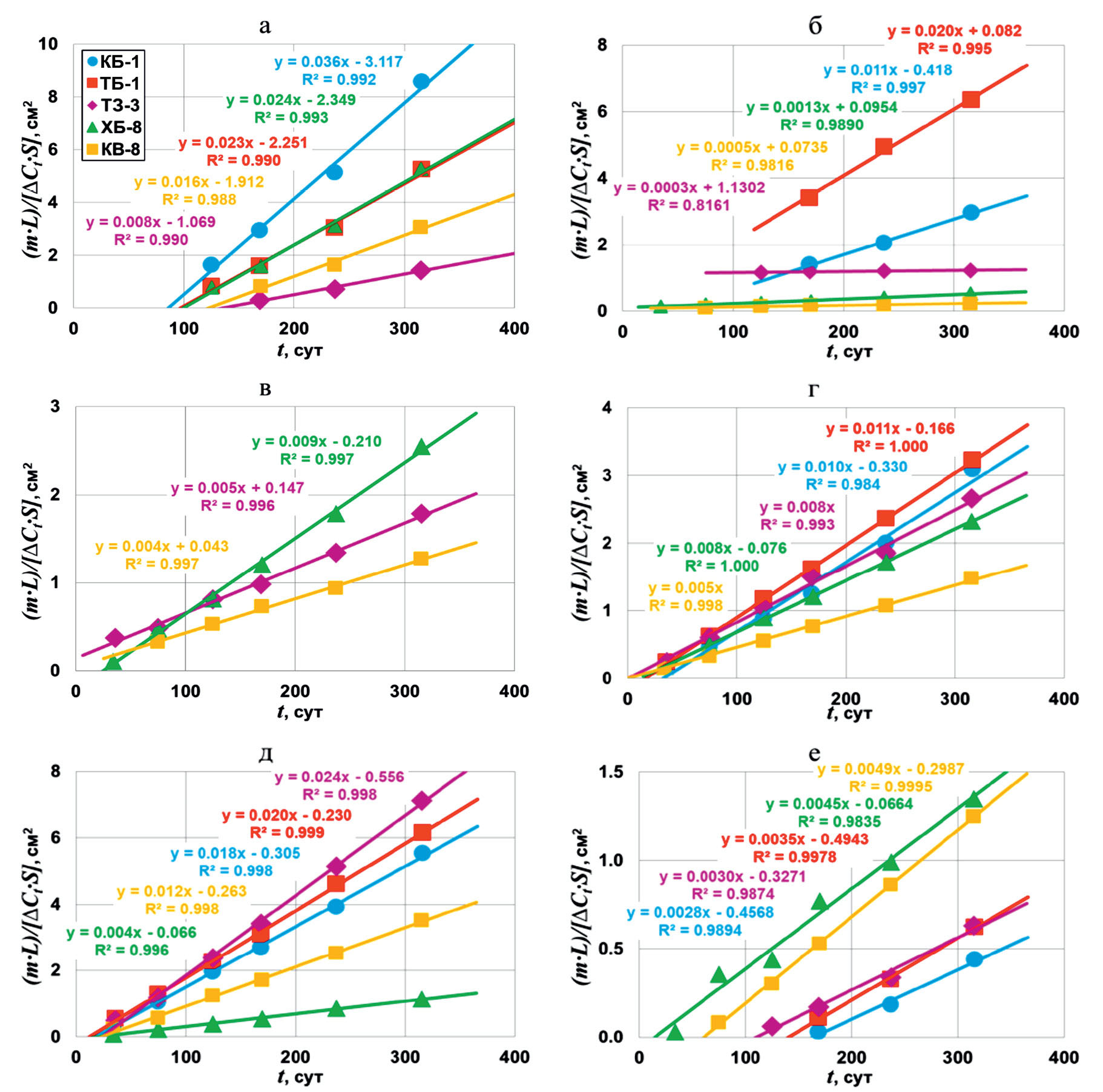 Диффузия молибдена (рис. 2г) и брома (рис. 2д) происходила стационарно по типу 1 или с небольшой (в пределах погрешности экспериментов) сорбционной задержкой. Максимальная скорость диффузии для молибдена наблюдалась в образце ТБ, для брома – ТЗ, минимальная: для молибдена – в образце КБ, для брома – КВ. Диффузия фосфора в изученных материалах происходила по типу 2 с сорбционной задержкой от 20 (ХБ) до 170 (КБ) суток. Максимальная скорость диффузии фосфора наблюдалась в образцах ХБ и КВ, минимальная – в образцах КБ и ТЗ.