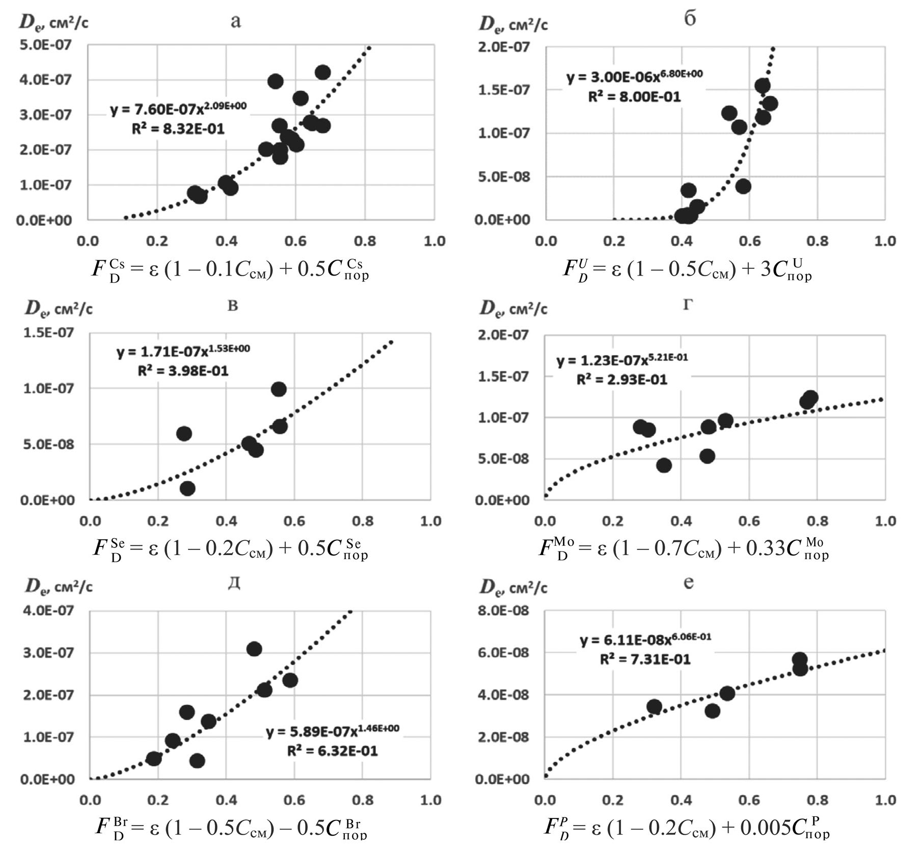 Результаты, полученные для брома на разных глинах (табл. 4), но в однотипных растворах, лежат в разных частях диапазона значений D eI , что подчеркивает значимость для диффузии других факторов, кроме плотности скелета материалов. Поэтому полученные новые результаты по эффективным коэффициентам диффузии элементов РАО вместе с опубликованными ранее данными были описаны в рамках модели, предложенной в работах [4, 5], в форме зависимостей De от общего фактора диффузии FD (б/р), который суммирует эффект частных факторов: пористости образца (ε, б/р), содержания смектита в образце (Cсм, б/р) и концентрации радионуклида (элемента) в поровом растворе (Спор, мг/л).