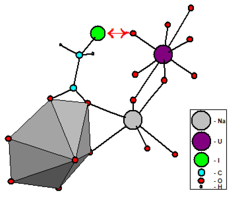 Из двух показанных атомов иода верхний (I3) входит в состав иона mia, который координирован к атомам U и Na только двумя атомами кислорода и реализует бидентатный тип координации B21–4. Ион mia, который содержит нижний атом (I7), проявляет по отношению к атомам U и Na тридентатный тип координации T12–45 (IO2), где в соответствии с [14] в круглых скобках указана природа всех донорных атомов лиганда, а число 45 указывает, что при координации возникают 4- и 5-членный циклы.