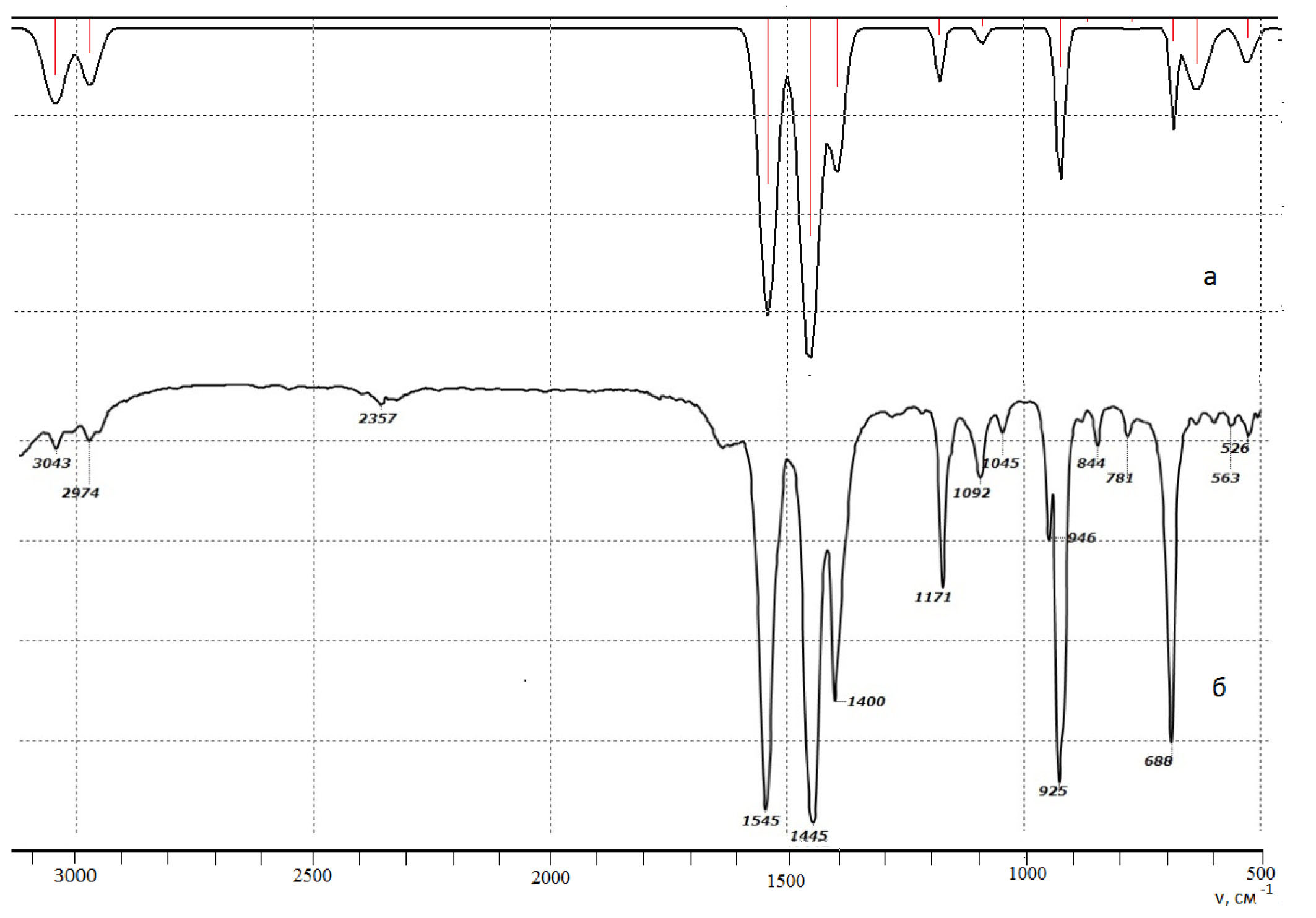 Рис. 5. Теоретический (а) и экспериментальный (б) ИК-спектры NaUO2(CH2ICOО)3. Отрезки красного цвета отвечают рассчитанным частотам и интенсивностям колебаний.