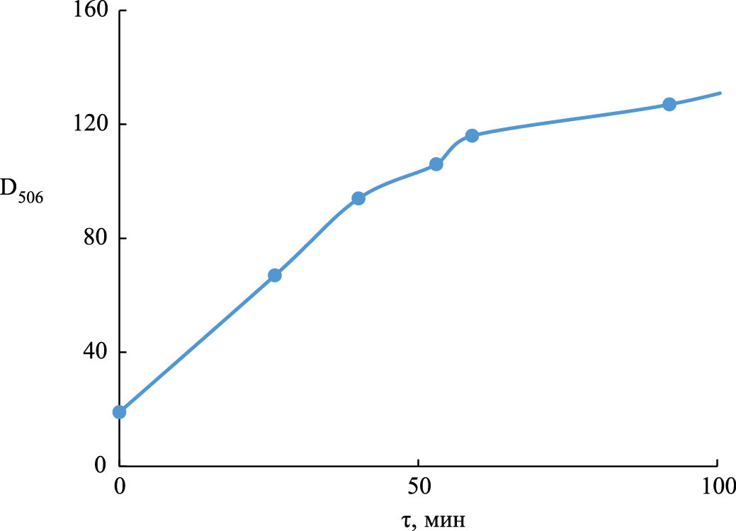 Рис. 1. Кинетическая кривая накопления Pu(IV) в результате диспропорционирования Pu(V) в растворе 28 ммоль/л ЭДТА (рН 2.91) при 45°C. [Pu(V)]0 = 2.87 ммоль/л.
