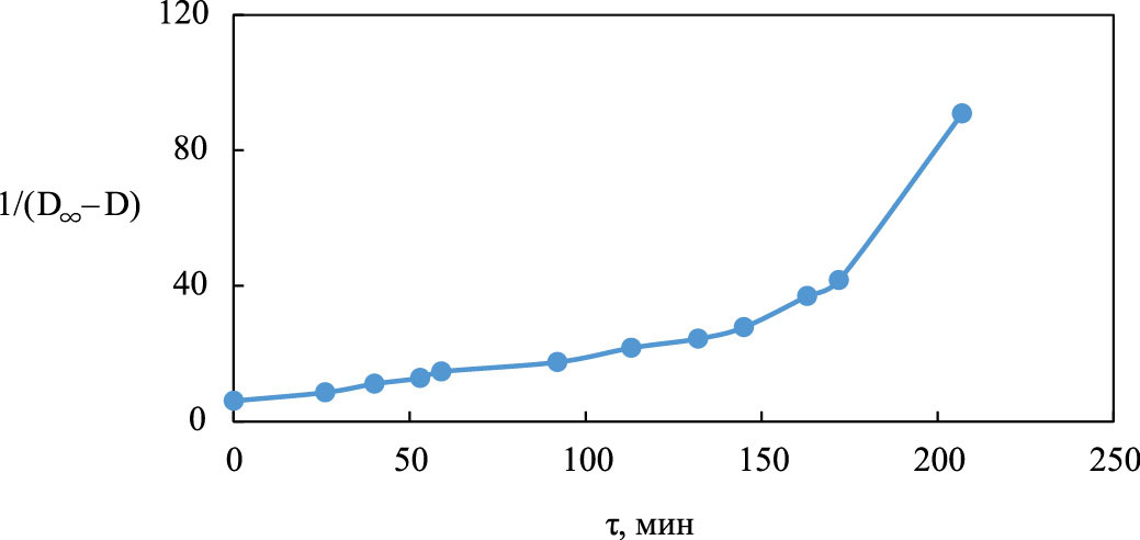 Кинетика реакции диспропорционирования Pu(V)может быть представлена в координатах 1/[Pu(V)] – время или 1/([Pu(IV)max – [Pu(IV)])–время. После замены концентрации Pu(IV)] на пропорциональную ей величину DIV при 505 нм получаем координаты 1/(DIVmax – DIV) – время. На рис. 2 в координатах 1/(Dmax – D) – время приведена кинетическая кривая накопления Pu(IV), т.е. трансформация кинетической кривой, представленной на рис.1. Начальный участок спрямляется, но через 100 мин, когда прореагировало 75% Pu(V), наблюдается отклонение вверх, т.е. по мере протекания реакции происходит её ускорение, хотя по ходу реакции рН увеличивается и скорость должна снижаться. Подобное явление имело место при исследовании диспропорционирования Np(V) в растворе бифталата калия + ЭДТА [5]. В этой работе Np(V) получали добавлением ЭДТА к раствору Np(VI). Реакция протекала быстро, но возникающие при этом фрагменты молекул ЭДТА медленно реагировали с Np(V) и увеличивали выход Np(IV).