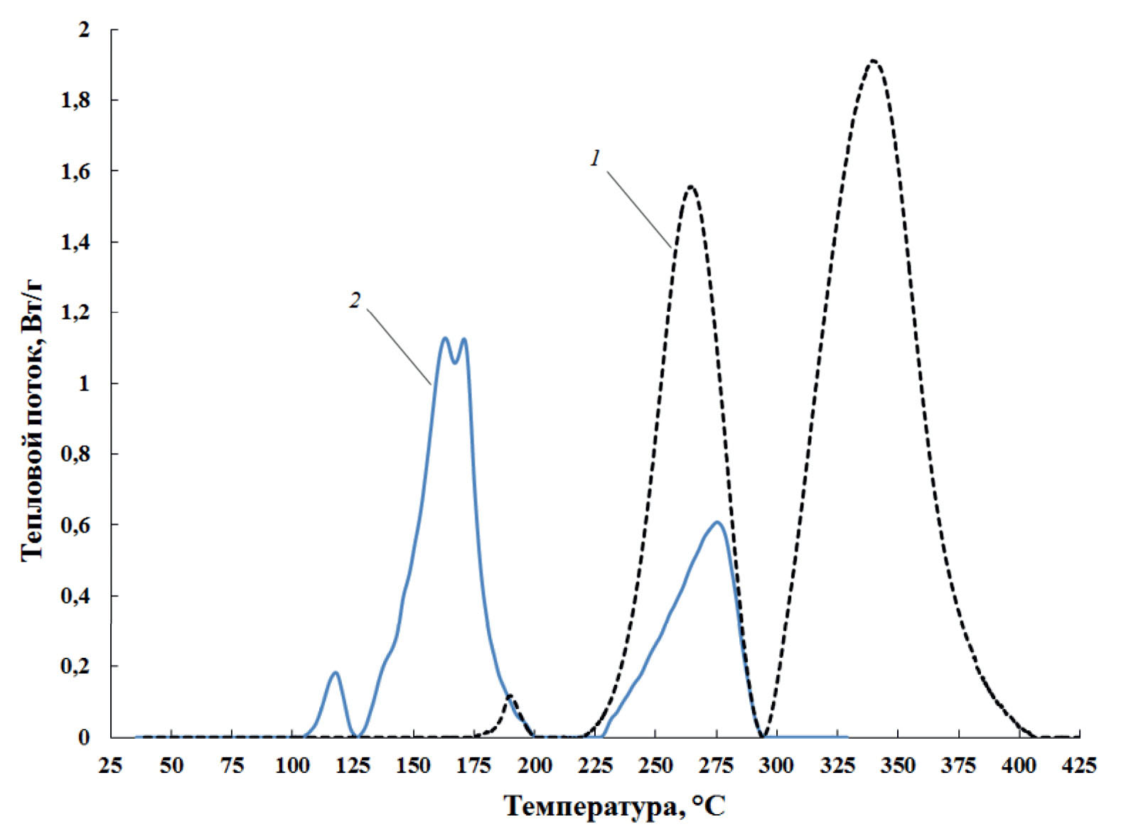 На рис. 1 представлена зависимость удельного теплового потока от температуры нагрева воздушно-сухого необлученного (кривая 1) и облученного (кривая 2) анионита ВП–1АП в нитратной форме. Каждая стадия характеризуется соответствующим пиком. Рассчитанные значения Qуд и температуры начала экзотермической реакции (Тст) приведены в табл. 1.