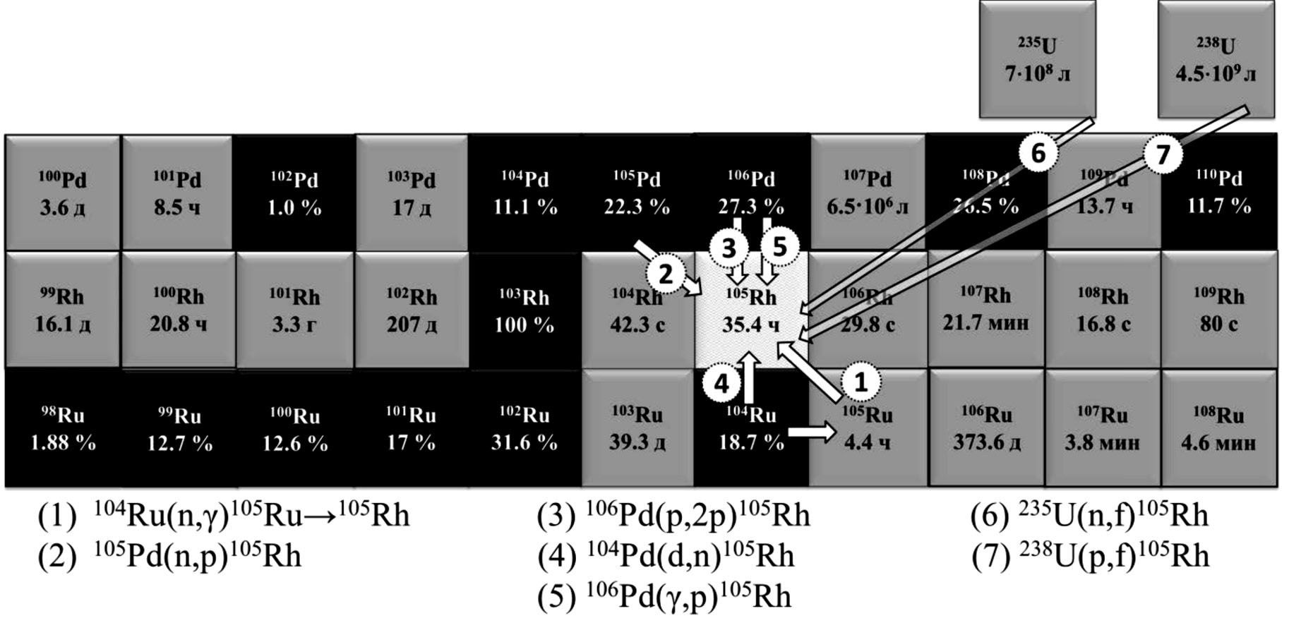 Рис. 1. Известные подходы к получению 105Rh без носителя на фрагменте нуклидной карты. В чёрных клетках стабильные ядра и их содержание в естественной смеси, в серых – радиоактивные ядра и их T1/2; метастабильные ядра не отмечены.