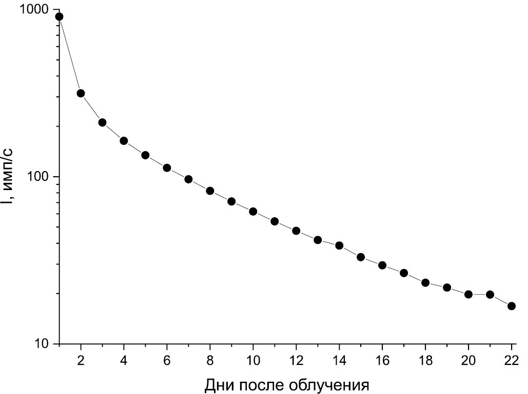 Как видно из табл. 1, суммарная активность всей облучённой мишени определяется в основном активностью изотопов палладия (95% от общей активности), при этом T1/2 каждого изотопа не превышает 4.5 сут. Из полученной нами зависимости скорости счёта мишени от времени после облучения установлено, что уже через неделю скорость счёта составляет 11%, а через три недели – 2% от исходной. При этом PdCl2 легко может быть получен из элюата фракций палладия путём упаривания раствора до сухих солей. Это позволяет через месяц выдержки облучённой мишени повторно её использовать для наработки 105Rh, что снижает стоимость его регулярной наработки в случае использования обогащённой по 106Pd мишени.