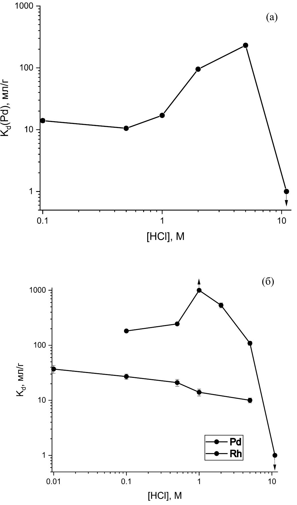 Рис. 3. Kd палладия на DGA (a) и палладия и родия на TEVA (б) в зависимости от концентрации растворов HCl.