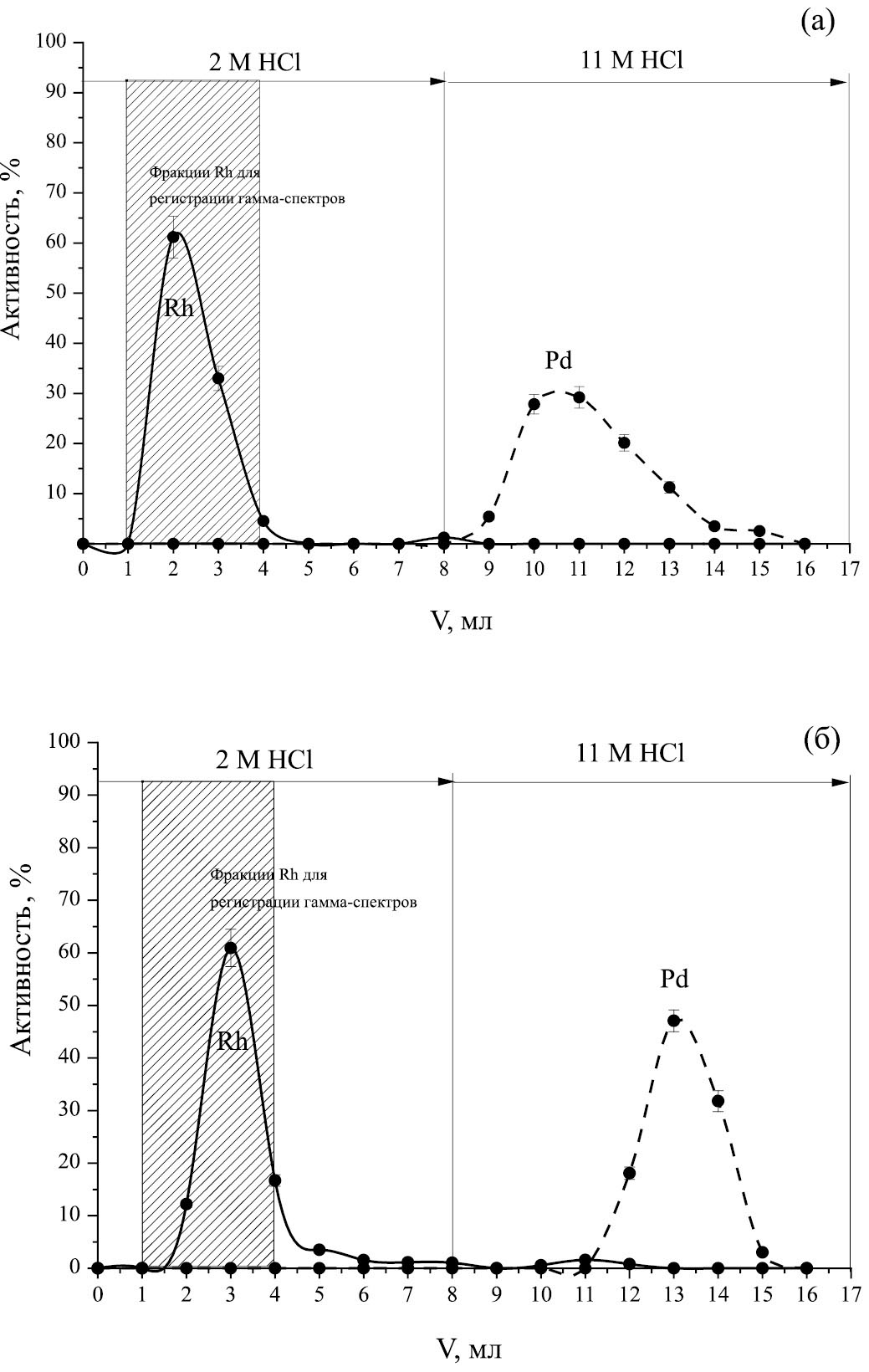 Извлечение изотопов родия из облучённого PdCl2 на изучаемых сорбентах проводили путём растворения PdCl2 в 2 М HCl и пропускания раствора через колонку. При этом в случае как с DGA, так и с TEVA родий частично сорбировался на колонках, а палладий сорбировался полностью. Колонки затем промывали раствором 2 М HCl до полного удаления родия, после чего промывали их раствором 11 М HCl для десорбции палладия; кривые элюирования представлены на рис. 3. Из данных на рис. 3а видно, что почти весь родий быстро десорбируется с колонки при пропускании раствора 2 М HCl, при этом при смене среды около 2% родия выходит в первой фракции элюата, после чего количественно десорбируется палладий. Это может быть связано как с существованием различных форм родия в растворе, так и с тем, что палладий как макро-компонент частично выступает неизотопным носителем родия. Из данных на рис. 3б видно, что родий медленно десорбируется с колонки TEVA, в связи с чем не удаётся достичь полного разделения палладия и родия на данном сорбенте.