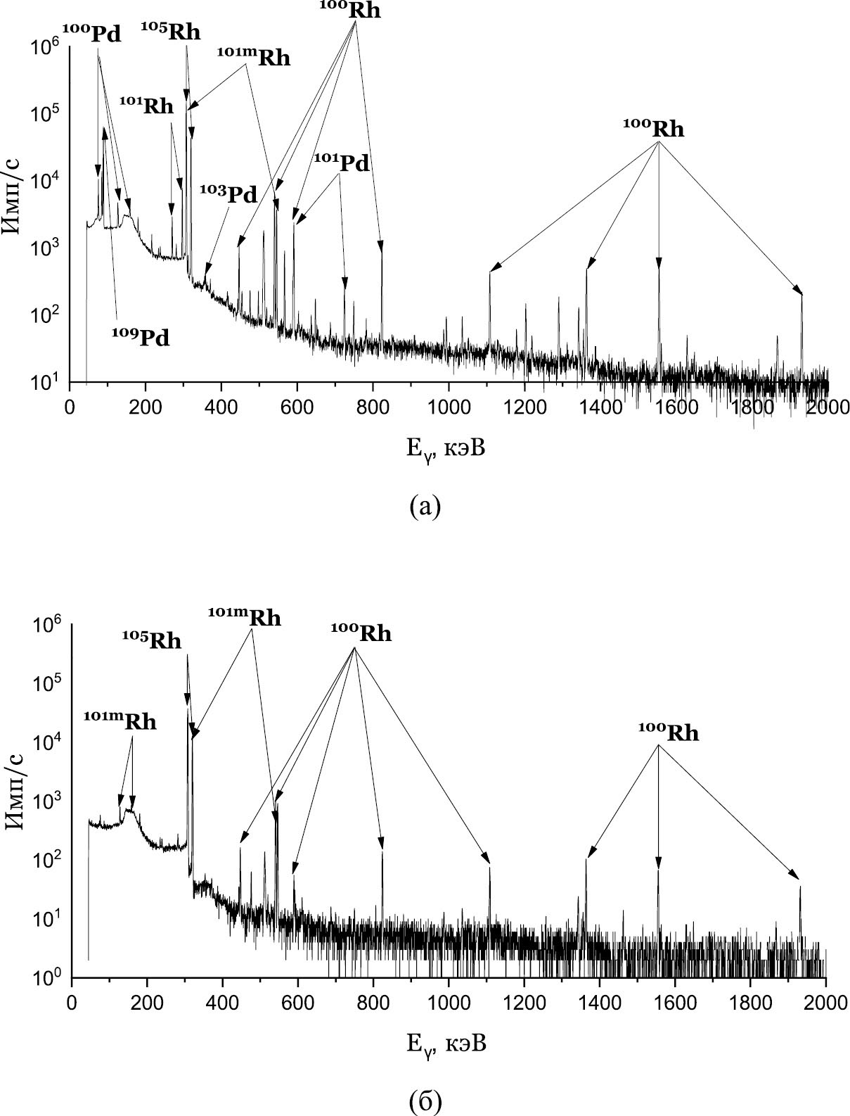 Рис. 5. Гамма-спектры облученного PdCl2 (a) и фракций родия после извлечения на DGA (б).