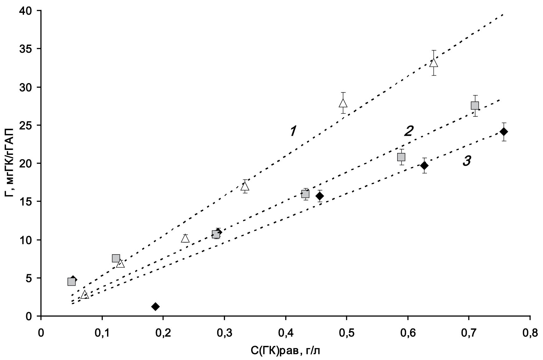Рис. 5. Изотерма сорбции ГК различной Mw на ГАПп: 1 – 2.37 МДа; 2 – 0.2 МДа; 3 – 0.1 МДа.