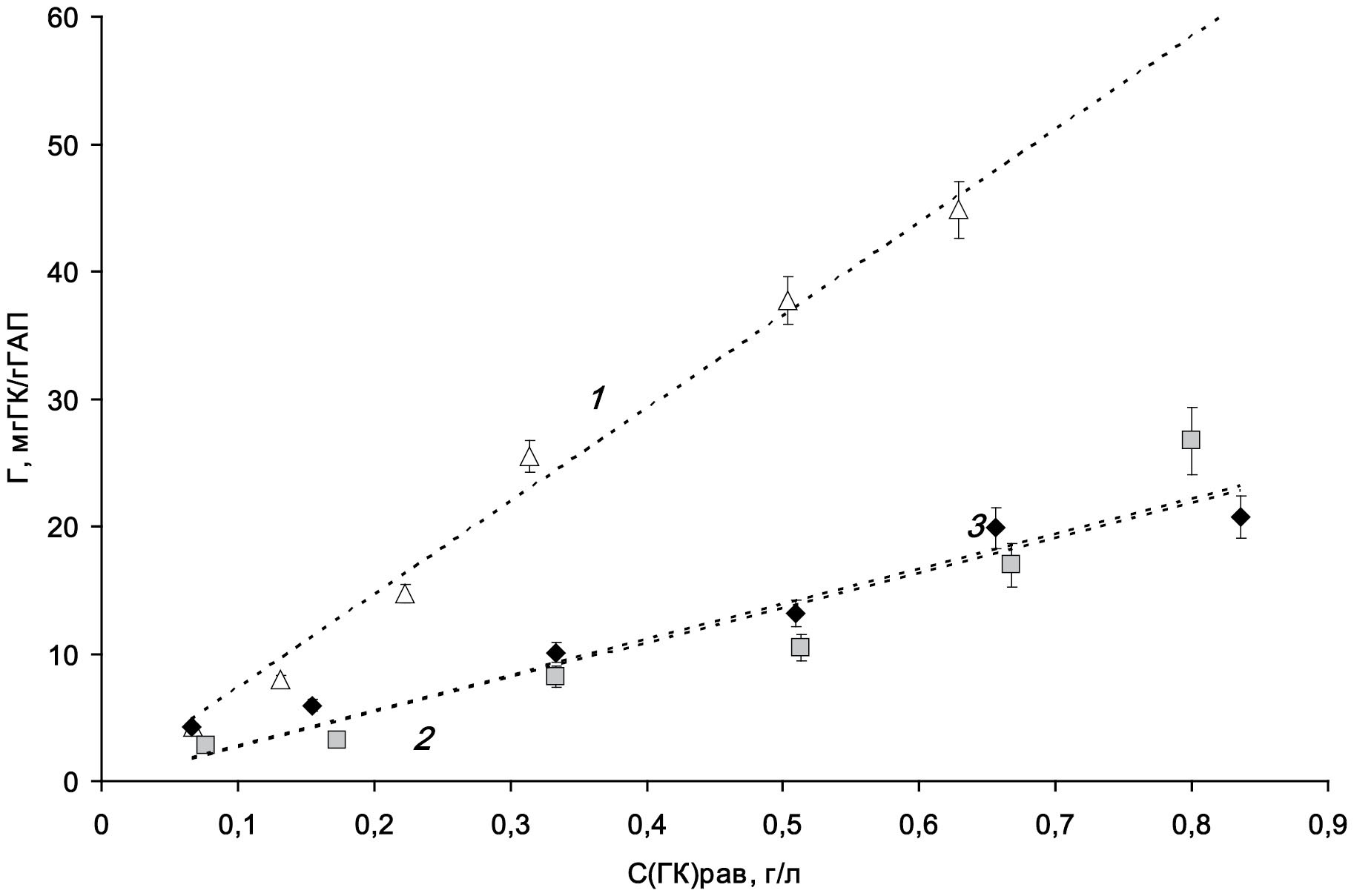 Рис. 6. Изотерма сорбции ГК различной Mw на ГАПс: 1 – 2.37 МДа; 2 – 0.2 МДа; 3 – 0.1 МДа.