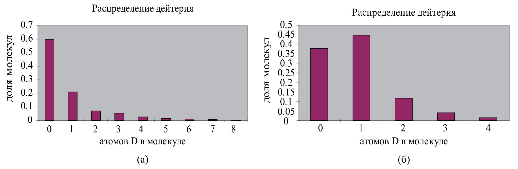 При использовании твердофазного метода была проведена серия опытов, где одинаковую смесь выдерживали в атмосфере газообразного дейтерия при разных температурах (125–170°C) в течение 10 мин. При этом оказалось, что включение дейтерия при использовании твердофазного метода, даже при более высокой температуре, не имело преимущества перед использованием D2O (рис. 1).