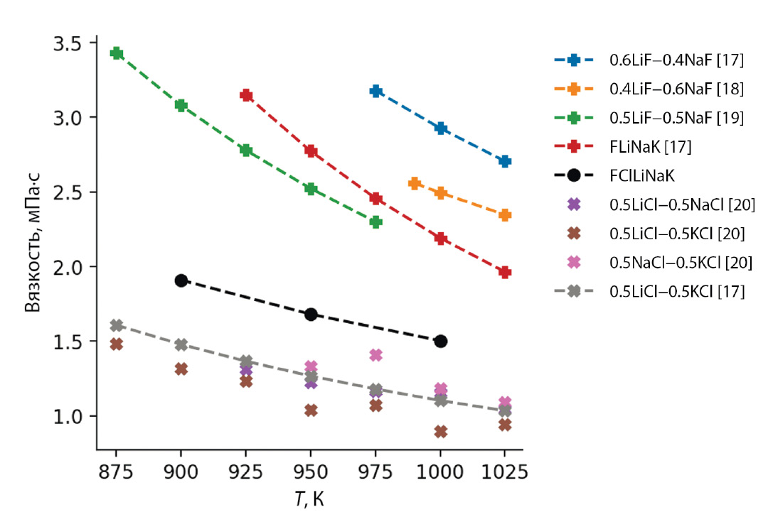 Значения плотности, теплоемкости и коэффициента теплопроводности для высокоэнтропийного состава немного меньше, чем у FLiNaK. Вязкость оказывается ниже, что связано с понижением плотности за счет значительной доли хлоридов. Это может быть определенным преимуществом перед FLiNaK за счет лучших показателей течения.