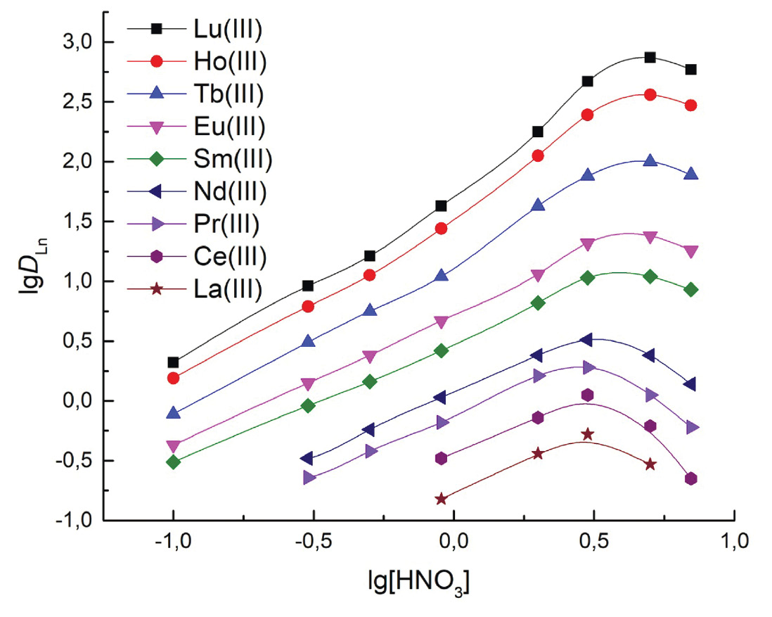 Исходные водные растворы готовили растворением соответствующих нитратов Th(IV), U(VI) и Ln(III) в воде с последующим добавлением HNO3 до требуемой концентрации. Все ионы Ln(III) (кроме Pm) присутствовали в растворе, исходная концентрация каждого из них составляла 1 × 10–5 моль/л. Контакт фаз осуществляли при температуре 22 ± 2°С на аппарате для перемешивания со скоростью 60 об/мин в течение 1 ч, что достаточно для установления постоянных значений коэффициентов распределения (D).