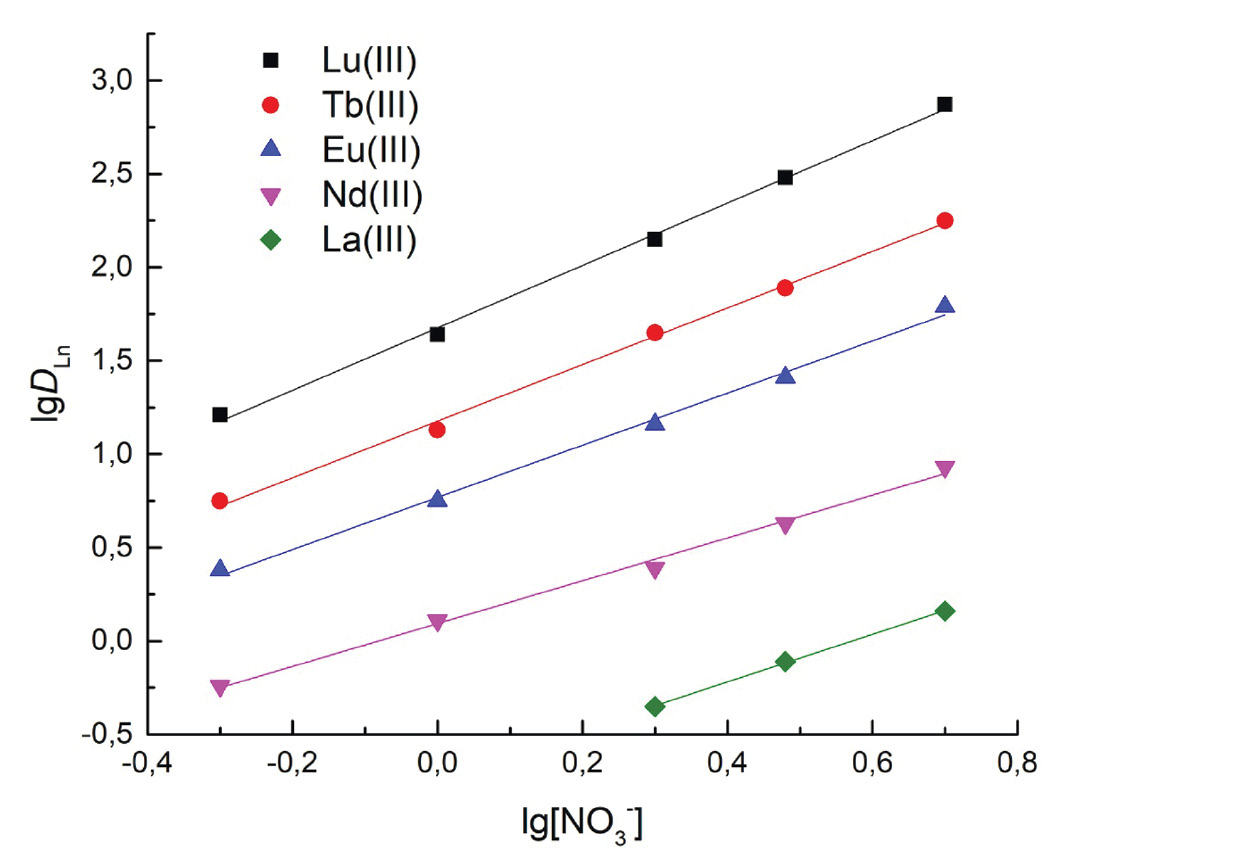 При постоянной кислотности водной фазы увеличение в концентрации ионов NO3 в ней сопровождается ростом DLn при экстракции смесью ТОДГА–DDAH2SSu (рис. 5). Тангенс угла наклона зависимости lgDLn–lg[NO3] для всех Ln(III) составляет 1.5 ± 0.1. Это указывает на участие ионов NO3 в образовании экстрагируемых комплексов в системах с ТОДГА и DDAH2SSu.